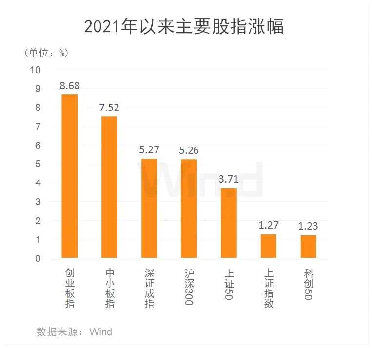 從今年以來A股表現(xiàn)來看,主要股指均不同程度上漲,其中創(chuàng)業(yè)板指漲幅達8.68%,位居首位;中小板指數(shù)、深證成指、滬深300漲幅均超過5%;僅上證指數(shù)和科創(chuàng)50漲幅較小,在2%以內(nèi)。