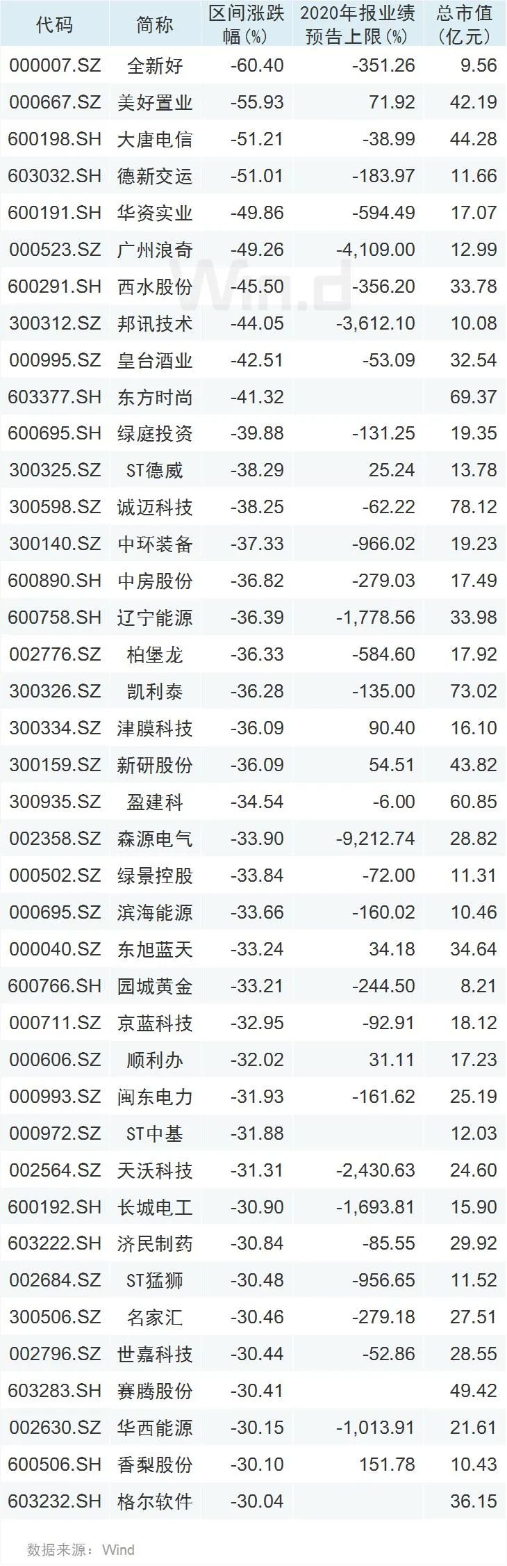 雖然有近200家公司股價創(chuàng)年內(nèi)新高,但同時有600多家公司創(chuàng)2020年以來新低。從創(chuàng)新低公司股價表現(xiàn)來看,有40家公司今年以來股價跌幅超過30%,跌幅靠前絕大多數(shù)為業(yè)績預告爆雷公司,同時多數(shù)跌幅較大的公司市值普遍低于50億元。