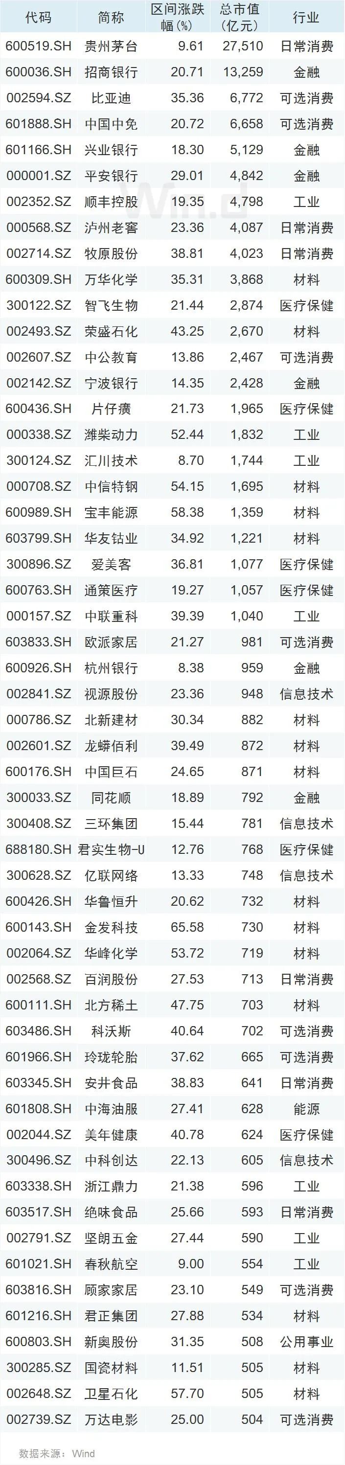 從創(chuàng)新高公司股價表現(xiàn)來看,有54家公司總市值超過500億元,千億市值以上的亦有23家,其中貴州茅臺、招商銀行、比亞迪、中國中免、興業(yè)銀行、平安銀行、順豐控股、瀘州老窖、牧原股份、萬華化學、智飛生物、【榮盛石化(002493)、股吧】、中公教育、寧波銀行等公司市值在2000億元以上。多家大市值公司今年以來漲幅甚至超過50%。(剔除11月以來上市新股)