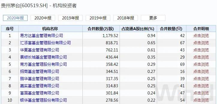 從基金公司公布的2020年報數(shù)據(jù)來看,有100多家基金公司持有茅臺,頭部基金公司普遍重倉茅臺。其中,易方達基金公司旗下42只基金合計持有1179.52萬股,位居首位;匯添富基金旗下67只基金合計持有818.71萬股,緊隨其后。