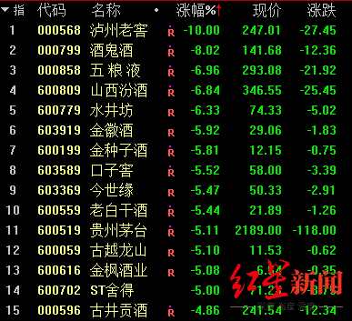 繼2月22日白酒股集體大跌之后,今日白酒股再度慘遭“血洗”。截至下午收盤,瀘州老窖(000568.SZ)跌停,酒鬼酒(000799.SZ)跌8.02%,五糧液(000858.SZ)跌6.96%,山西汾酒(600809.SH)跌6.84%。