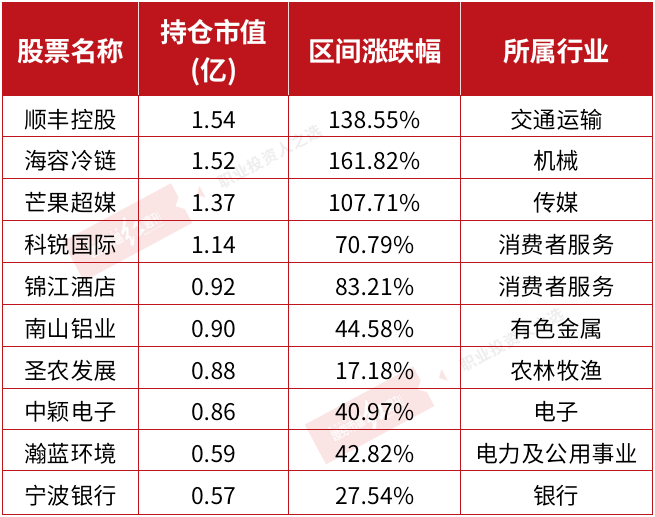 此外,進(jìn)行冷鏈設(shè)備研發(fā)、生產(chǎn)、銷售、服務(wù)的【海容冷鏈(603187)、股吧】也連續(xù)三季度被該基金重倉;以視頻軟件為主要業(yè)務(wù)的新媒體產(chǎn)業(yè)公司芒果超媒也排在重倉股的前列……而它們?cè)谌ツ甑臐q幅都頗為可觀,順豐控股、海榮冷鏈和芒果超媒的股價(jià)漲幅分別達(dá)到了138.55%、161.82%和70.79%。