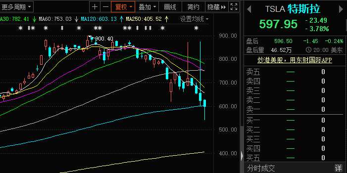 3月5日,特斯拉跌破600美元關(guān)口,最新股價為597.95美元每股。至此,特斯拉從1月26日的900美元高峰,跌至最新的不足600美元,跌幅超過30%。