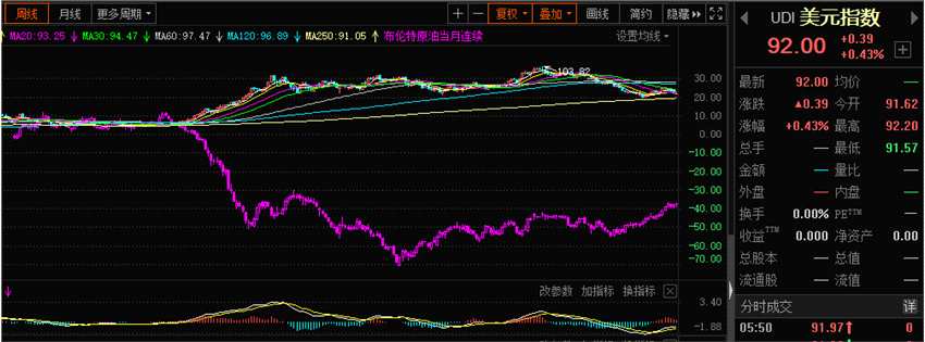 與此同時,還可以看到10年期美債收益率再度攀升至1.61%以上。按慣常的邏輯,美元指數(shù)與大宗商品的走勢應(yīng)該相反,從歷史走勢來看,也是這樣。只有美元下跌時,通脹預(yù)期才會起來。然而,此刻美元大舉反攻,一周內(nèi)收出三連陽,目前已經(jīng)收到了92上方。