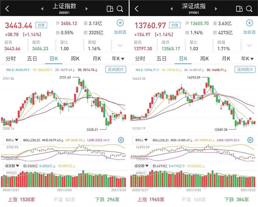 至3月22日收盤,上證綜指漲1.14%,報(bào)3443.44點(diǎn);科創(chuàng)50指數(shù)漲0.93%,報(bào)1242.76點(diǎn);深證成指漲1.14%,報(bào)13760.97點(diǎn);創(chuàng)業(yè)板指漲1%,報(bào)2698.26點(diǎn)。