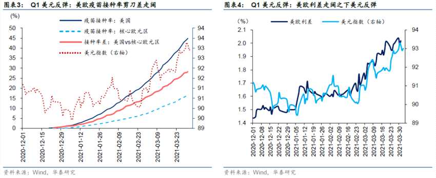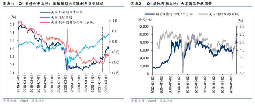 Q1,全球宏觀經(jīng)歷了“再通脹預(yù)期”向“通脹預(yù)期”的升級(jí),美債利率由通脹預(yù)期和實(shí)際利率交替推升,美元指數(shù)在疫情節(jié)奏差和經(jīng)濟(jì)特質(zhì)差兩點(diǎn)影響之下反彈,全球權(quán)益資金回流相對(duì)基本面彈性大的美國、填補(bǔ)疫情減壓較晚的歐洲洼地。