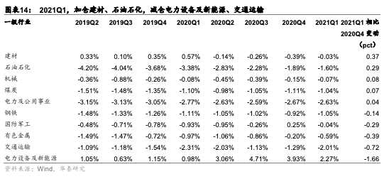 2021Q1,偏股型基金對(duì)建材、石油石化、機(jī)械等板塊超(低)配比例提升明顯,下降明顯的是電力設(shè)備及新能源、交通運(yùn)輸?shù)?。?xì)分領(lǐng)域看,主要加倉石油化工、化學(xué)原料、煤炭開采洗選等,減倉電源設(shè)備、新能源動(dòng)力系統(tǒng)等。