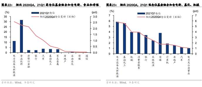 我們以股票配置比重前 50 的主動(dòng)偏股型基金表征高倉位基金組合,以股票配置比重后 50的主動(dòng)偏股型基金表征低倉位基金組合(部分為 2020 年四季度新成立基金)。行業(yè)配置差異看,2021Q1 高倉位基金組合主要配置于食品飲料、電力設(shè)備及新能源和醫(yī)藥;而低倉位基金組合主要配置于食品飲料、醫(yī)藥、家電,以消費(fèi)和金融為主。行業(yè)配置和重倉股持倉變動(dòng)看,相比 2020Q4,2021Q1 高倉位基金組合加倉電力設(shè)備及新能源、食品飲料和非銀金融,減倉計(jì)算機(jī)、家電、電子;低倉位基金組合則加倉電力設(shè)備及新能源、基礎(chǔ)化工、機(jī)械,減倉有色金屬、家電、石化。