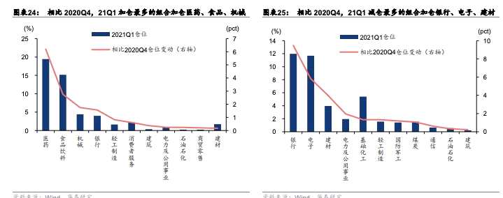 我們以股票配置比重提升前 50 的主動(dòng)偏股型基金表征加倉最多的基金組合,以股票配置比重下降后 50 的主動(dòng)偏股型基金表征減倉最多的基金組合。行業(yè)配置差異看,2021Q1 加倉最多的基金組合主要配置于醫(yī)藥、食品飲料、電子;而減倉最多的基金組合主要配置于食品飲料、銀行、電子。行業(yè)配置和重倉股持倉變動(dòng)看,加倉最多的基金加倉醫(yī)藥,減倉計(jì)算機(jī)。相比 2020Q4,2021Q1 加倉最多的基金組合加倉醫(yī)藥、食品飲料、機(jī)械,減倉計(jì)算機(jī)、國防軍工、電子;減倉最多的基金組合則加倉銀行、電子、建材,減倉食品飲料、汽車、機(jī)械。