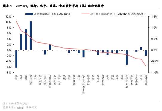 2021Q1,偏股型基金對(duì)非銀金融超(低)配比例明顯提升,房地產(chǎn)超(低)配比例下降。