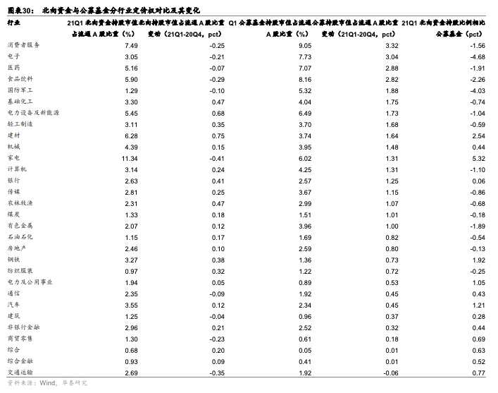 相比 2020Q4,2021Q1 公募對(duì)消費(fèi)者服務(wù)、電子、醫(yī)藥、食品飲料、國防軍工、家電、通信、建筑、商貿(mào)零售等的定價(jià)權(quán)邊際提升,而北向資金定價(jià)權(quán)弱化;公募與北向資金對(duì)基礎(chǔ)化工、電力設(shè)備及新能源、輕工制造、建材、機(jī)械、計(jì)算機(jī)、銀行、傳媒、農(nóng)林牧漁、煤炭、有色金屬、石油石化、房地產(chǎn)等的定價(jià)權(quán)均有提升,但對(duì)交通運(yùn)輸?shù)亩▋r(jià)權(quán)均有所弱化。