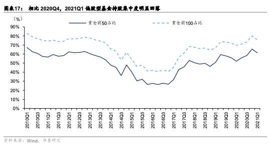 2021 年一季報(bào)顯示,重倉前 50 標(biāo)的持倉市值占偏股型基金重倉股持股市值 61.44%,環(huán)比減少 4.05pct,持股集中度明顯回落。
