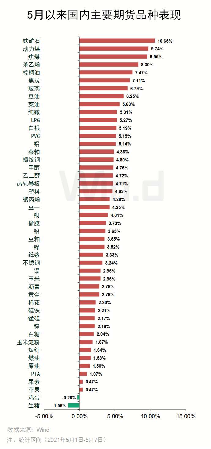 5月份以來(lái)的兩個(gè)交易日,以鐵礦石、動(dòng)力煤、焦炭的黑色系燃爆市場(chǎng),包攬5月漲幅榜前三。