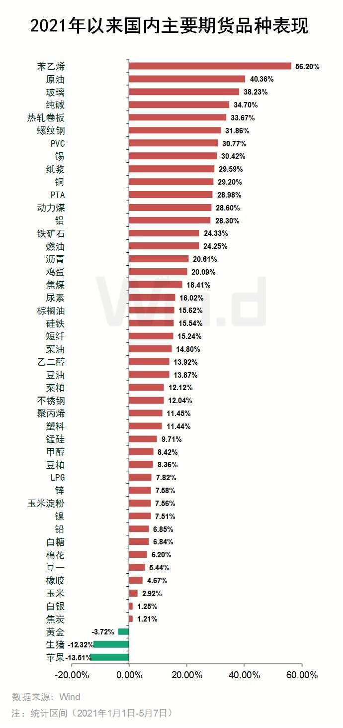 Wind數(shù)據(jù)顯示,2021年以來(lái),國(guó)內(nèi)47個(gè)成交額居前的期貨品種中,有45個(gè)品種價(jià)格上漲,其中,以苯乙烯為首的能化板塊品種漲幅較大,其中苯乙烯年內(nèi)漲幅高達(dá)56.2%位居首位,原油累計(jì)上漲40.36%,玻璃、純堿、熱軋卷板、螺紋鋼、PVC、錫等6個(gè)品種漲幅超30%,紙漿、銅、PTA、動(dòng)力煤、鋁、鐵礦石等9個(gè)品種漲幅超20%。僅蘋果、生豬和黃金期貨錄得下跌。