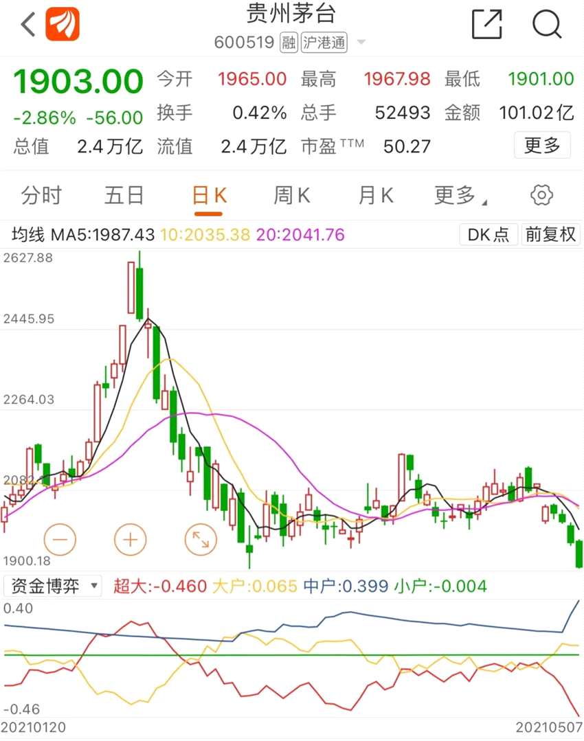 在報(bào)告數(shù)據(jù)的截至日期2月9日,貴州茅臺(tái)的收盤(pán)價(jià)為每股2456元,而在萬(wàn)億子彈論發(fā)布后的三個(gè)月后,即2021年5月7日,貴州茅臺(tái)的股價(jià)已經(jīng)跌破2000元,為每股1903元,期間貴州茅臺(tái)股價(jià)跌幅高達(dá)22%。
