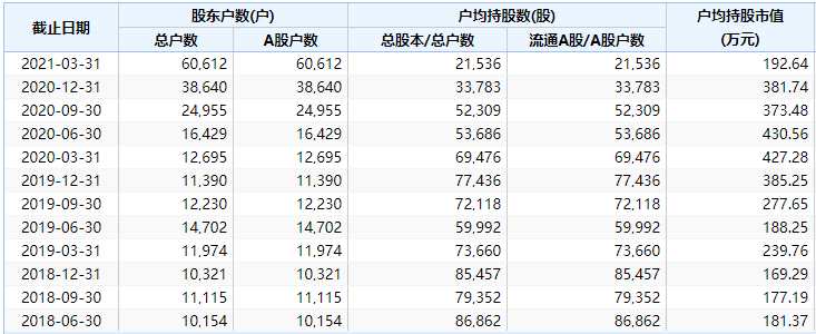 據(jù)Wind數(shù)據(jù)顯示,截至今年3月31日,該股股東人數(shù)為6.06萬戶,較2020年底的3.86萬戶大幅增長56.85%。