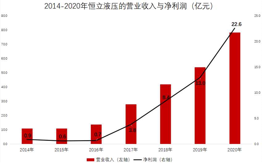 除了資金推動(dòng),恒立液壓的業(yè)績?cè)鲩L也是股價(jià)持續(xù)走牛的動(dòng)力。在工程機(jī)械行業(yè)景氣和配件國產(chǎn)替代的兩重邏輯疊加下,恒立液壓的營業(yè)收入、凈利潤一直處于高速增長。凈利潤由2014年的0.9億元增長至2020年的22.6億元,累計(jì)增幅達(dá)2411%。