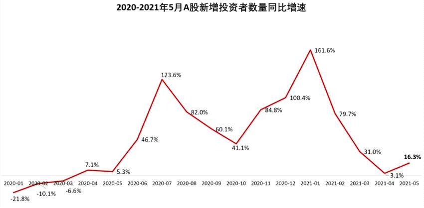從A股新增投資者的同比增速來(lái)看,2021年4月的同比增速僅有3.1%,而5月份的增速已回升至16.32%,連續(xù)3個(gè)月的增速下滑趨勢(shì)有望觸底反彈。