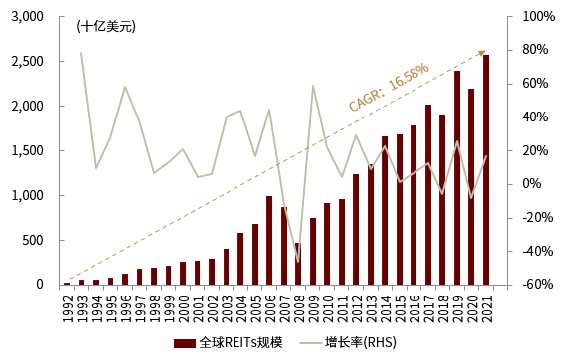 圖表:1992年以來全球REITs規(guī)模迅速增長,CAGR達16.58%