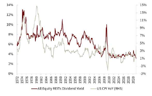 圖表:CPI長期走勢與美國REITs分紅收益一致,且CPI一定程度上領(lǐng)先