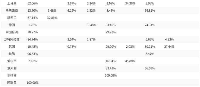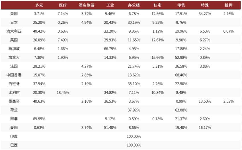 圖表:不同市場REITs各底層資產(chǎn)類別分布情況