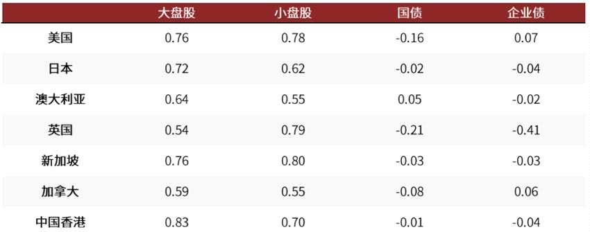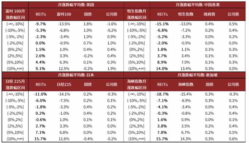 在不同市場中,REITs的月平均收益與相同市場的股票漲跌幅區(qū)間呈現(xiàn)出明顯的正相關(guān)關(guān)系。其中,股票市場指數(shù)處于(-∞,-10%],即股票市場處于極端行情時,中國香港和新加坡的REITs平均跌幅大于該市場的股市平均跌幅;英國和日本的平均跌幅低于該市場的股市平均跌幅,在極端情況下風(fēng)險低于股票市場。