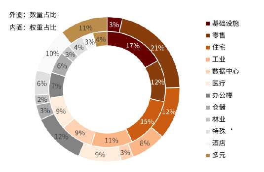 在行業(yè)上,我國公募REITs目前試點僅限于基礎(chǔ)設(shè)施領(lǐng)域,包括倉儲物流,收費公路、機場港口等交通設(shè)施,水電氣熱等市政設(shè)施,污染治理、信息網(wǎng)絡(luò)、產(chǎn)業(yè)園區(qū)等其他基礎(chǔ)設(shè)施,明確酒店、住宅和商業(yè)地產(chǎn)等不動產(chǎn)項目不屬于試點范圍。而海外REITs在行業(yè)覆蓋上較為廣泛。