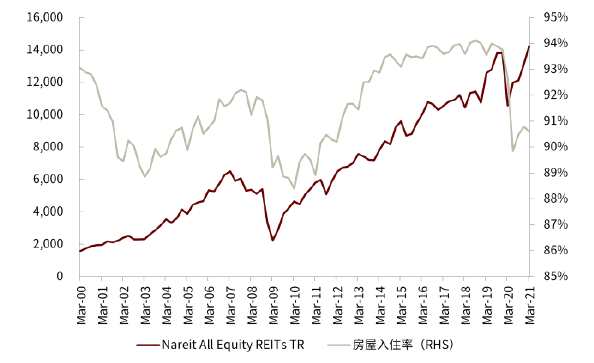 圖表:美國REITs指數(shù)與入住率長期走勢一致,歷年入住率下跌時也伴隨REITs下跌