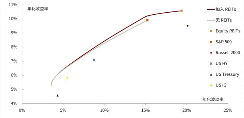 圖表:情景假設(shè)下REITs加入國內(nèi)股債基準(zhǔn)組合后能夠拓寬有效前沿