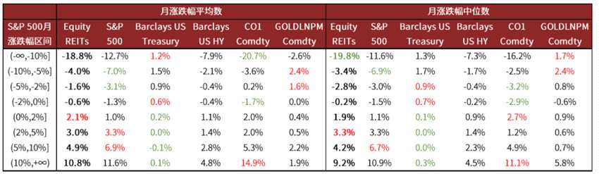 當(dāng)S&P 500指數(shù)月漲跌幅在(-10%,-5%],(-5%, -2%]和(-5%, -2%]區(qū)間內(nèi)時,Nareit All Equity REITs指數(shù)雖然同樣有負向中位數(shù)的月漲跌幅,但中位與平均月收益率均大于S&P 500指數(shù),表現(xiàn)出一定的抗風(fēng)險能力。