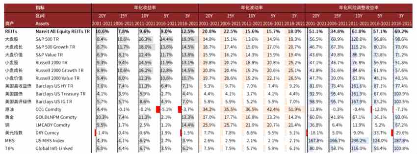 從經(jīng)濟周期看,REITs的波動率在衰退期顯著提升,在擴張初期和中期配置REITs 的性價比最高。我們參考NBER對美國經(jīng)濟周期的劃分,把1990年以來的時間區(qū)間劃分為衰退期和擴張期,并把擴張期等分為前、中、后三段,來看每個階段美國REITs和股債及商品等大類資產(chǎn)的風(fēng)險收益特征。REITs在擴張前期和中期表現(xiàn)最好,衰退期表現(xiàn)最差,這樣的特征類似于高收益?zhèn)?。REITs在衰退期的波動率顯著提高(38.1%),且高于除原油外的其他所有資產(chǎn),但是在擴張期,REITs的波動率與大盤股和小盤股相近。綜合回報率和波動率來看配置的性價比,在擴張初期和中期配置REITs的性價比最高。