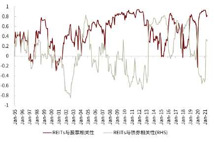 由于REITS的收益結(jié)構(gòu)主要包括分紅收益和增值收益兩部分,在分紅收益上,REITs的收益結(jié)構(gòu)類似于債券,使得REITs具備一定的債性;同樣,在增值收益上,REITs主要受到底層資產(chǎn)價格等因素影響,由于該部分收益結(jié)構(gòu)類似于權(quán)益產(chǎn)品,使得REITs同時也具備股性。在歷史表現(xiàn)中,REITs與股票及REITs與債券的相關(guān)性交替起伏(圖表14)。REITs整體與股票相關(guān)性更高,自2000年起至今美國REITs與股票的相關(guān)性為0.716。