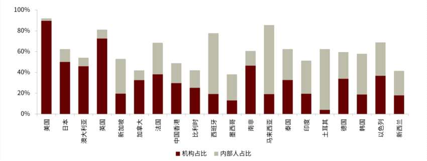 圖表:不同地區(qū)REITs機構(gòu)投資者和內(nèi)部人占比