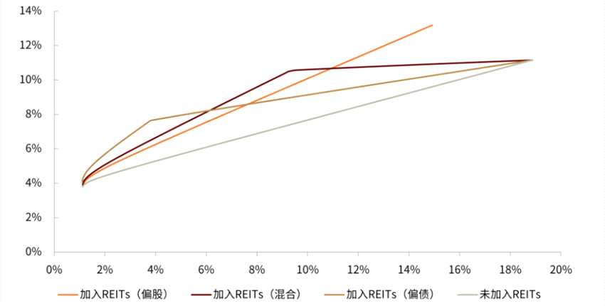 我們假設(shè)中國REITs的收益風(fēng)險特性呈現(xiàn)以下三種情景:偏股(80%股票+20%債券)、偏債(20%股票+80%債券)、混合(50%股票+50%債券),其中股票和債券收益分別用上證50和中債高收益?zhèn)笖?shù)進行模擬。經(jīng)測算,在股票(中證800)和債券(中債全債)基準(zhǔn)組合中加入REITs后能夠有效拓寬有效前沿,即在不提升波動率的前提下,通過在投資組合中加入REITs能夠增加收益。