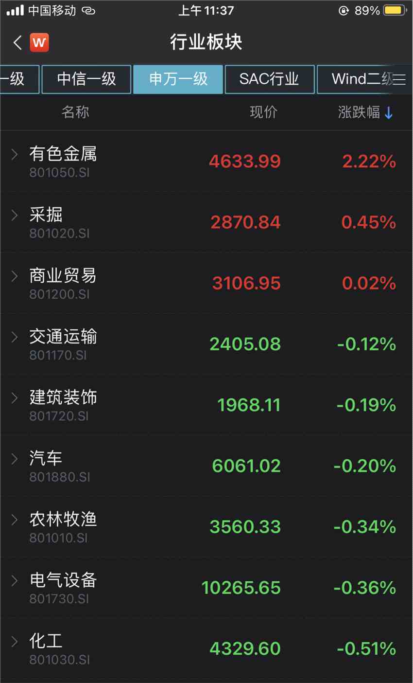 申萬(wàn)一級(jí)行業(yè)板塊中,僅有色金屬、采掘和商業(yè)貿(mào)易指數(shù)實(shí)現(xiàn)上漲,漲幅分別為2.22%、0.45%和0.02%。其他指數(shù)均下跌,跌幅居前的為休閑服務(wù)、食品飲料和醫(yī)藥生物,分別下跌4.89%、3.29%和3.03%。