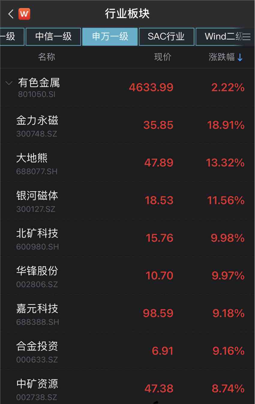 有色金屬指數(shù)成分股中,金力永磁漲18.91%,大地熊漲13.32%,【銀河磁體(300127)、股吧】漲11.56%,還有多只股票漲幅明顯。
