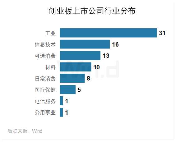 上半年新上市的創(chuàng)業(yè)板公司,主要分布在工業(yè)、信息技術(shù)、可選消費(fèi)和材料等行業(yè)中,其中工業(yè)行業(yè)有31家,遙遙領(lǐng)先。