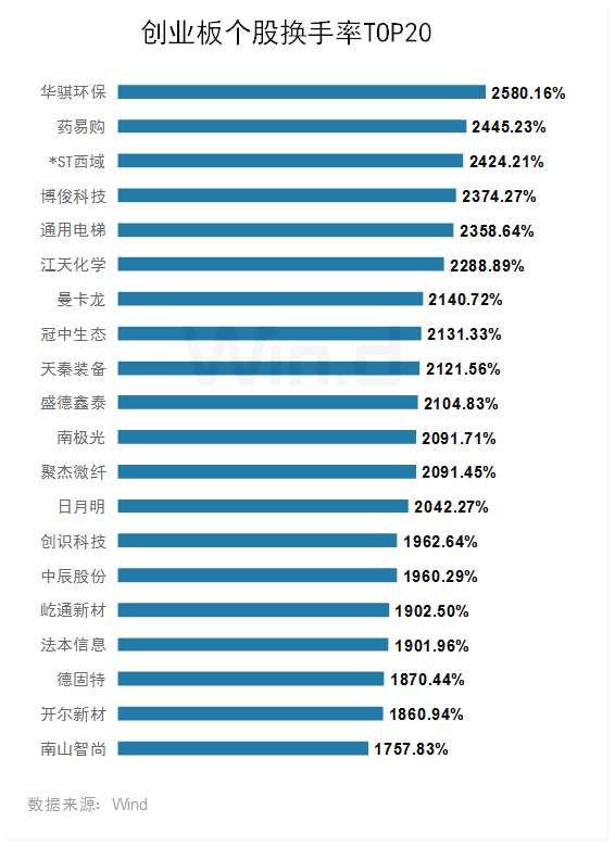 資金買賣活躍,2021年上半年13只個(gè)股換手率超20倍,最大的【華騏環(huán)保(300929)、股吧】達(dá)2580.16%。