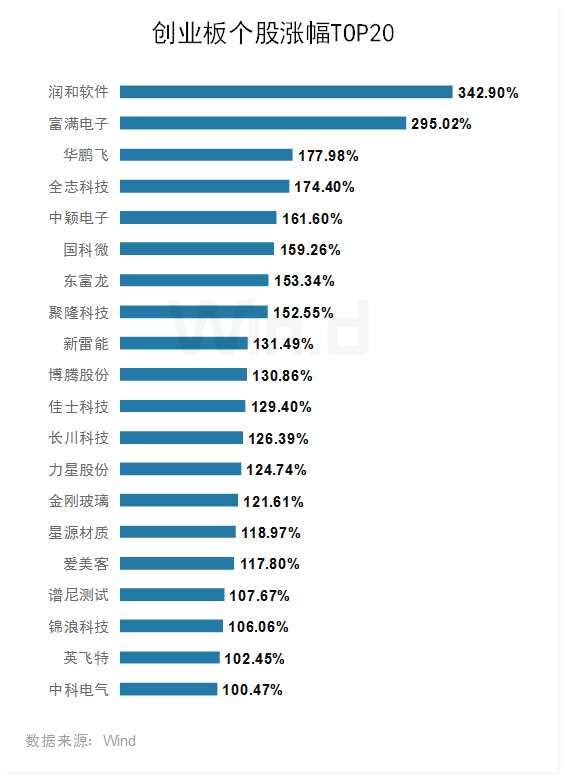 剔除新股上市首日巨大漲幅后,2021年上半年創(chuàng)業(yè)板個(gè)股漲少跌多。其中漲幅超過100%有20只,而2012年上市的【潤和軟件(300339)、股吧】漲幅最大為342.9%。