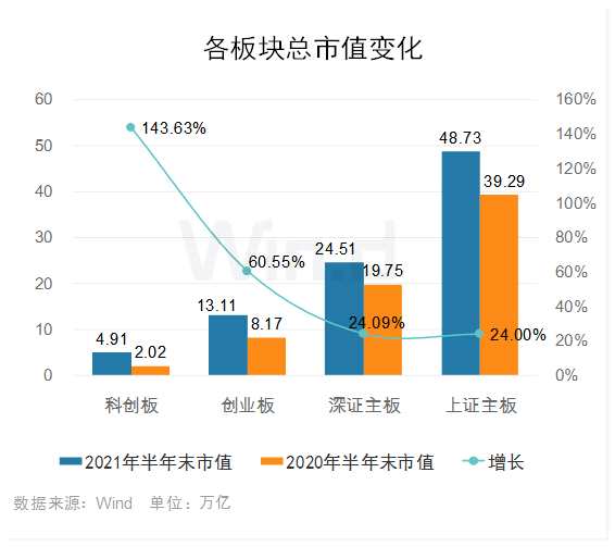 新股上市疊加行情上漲,各板塊總市值都大幅上漲,截至6月30日收盤,創(chuàng)業(yè)板總市值為13.11萬億元,較2020年6月30日總市值8.17萬億元上升4.94萬億,市值增長60.55%,位于增長榜第二位,僅次于科創(chuàng)板。