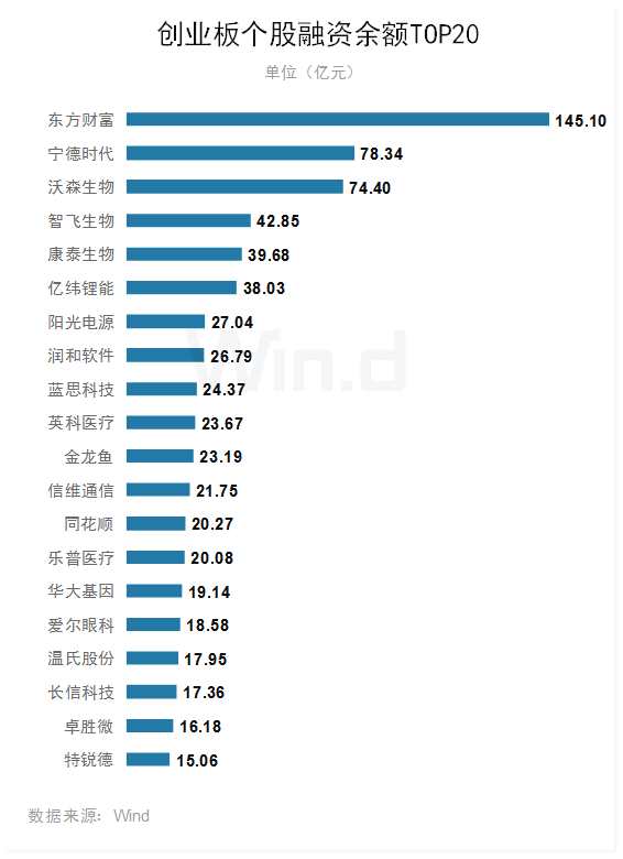 東方財(cái)富最受青睞,融資余額達(dá)145.1億位居首位,其次寧德時(shí)代、沃森生物等13只融資余額也都超過20億。