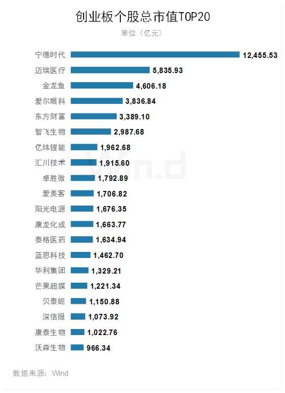 寧德時(shí)代遙遙領(lǐng)先,成功擠入萬億市值公司之列,僅次于主板的貴州茅臺(tái)、工商銀行、招商銀行和建設(shè)銀行。此外邁瑞醫(yī)療、【金龍魚(300999)、股吧】等5家市值超2000億。
