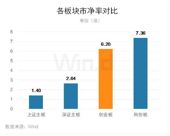 創(chuàng)業(yè)板市凈率為6.20倍,稍低于科創(chuàng)板,而大幅高于滬深主板。