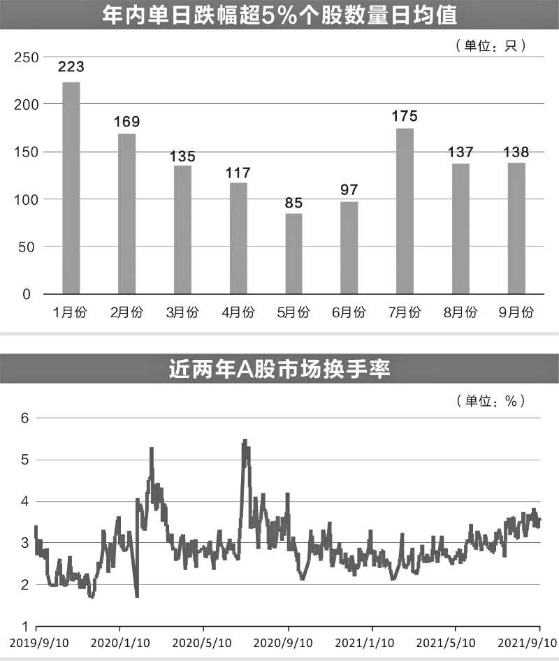 值得一提的是,自6月份后,A股市場大跌股數(shù)量顯著增加,以單日跌幅超過5%的個股數(shù)量來統(tǒng)計,7月份大跌股日均數(shù)量達到175只,8、9月份大跌股日均數(shù)量超過130只。