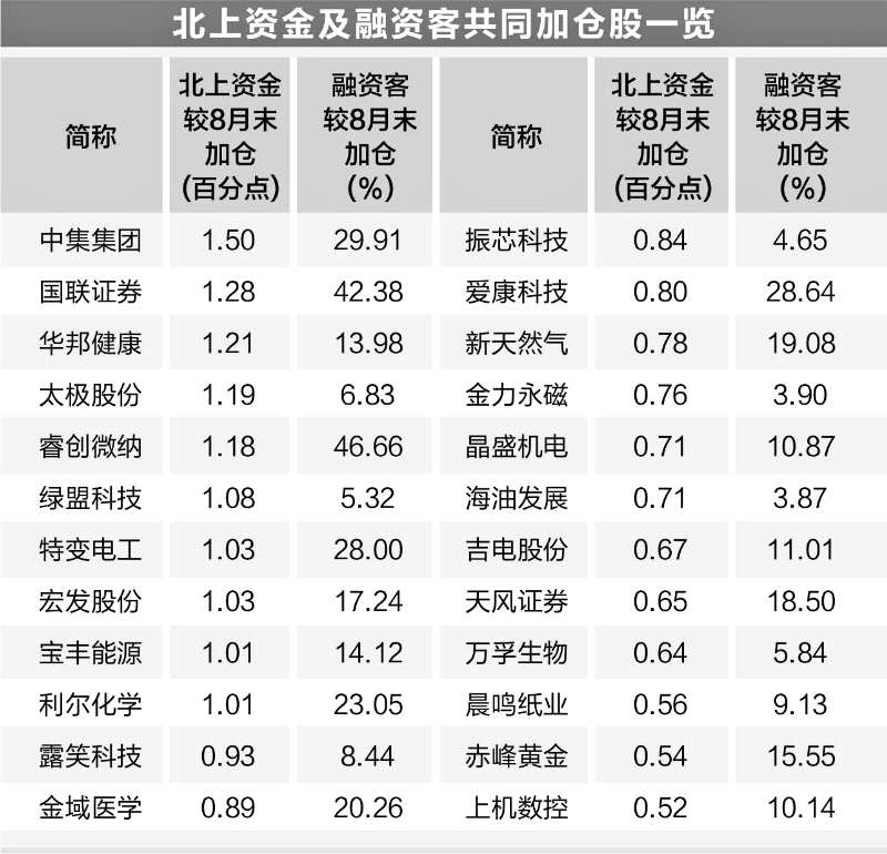 數(shù)據(jù)寶統(tǒng)計,9月份以來北上資金持股比例較8月份加倉0.5個百分點以上、融資客同期加倉幅度超3%以上的個股有24只,主要分布在電氣設(shè)備、公用事業(yè)、化工等行業(yè)。工業(yè)母機龍頭【上機數(shù)控(603185)、股吧】、氫能源龍頭寶豐能源均在列。上述個股中,北上資金加倉比例居前的有中集集團、國聯(lián)證券、華邦健康、太極股份等,均超過1個百分點;融資客加倉幅度超過20%的有睿創(chuàng)微納、國聯(lián)證券、中集集團等7股。