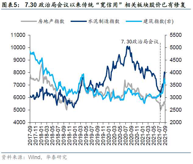 如前所述,“寬信用”并不能快速緩解基本面上的兩個(gè)壓力,甚至可能增加上游價(jià)格壓力,且“寬信用”預(yù)期在7.30政治局會(huì)議后已反映在一些板塊的股價(jià)修復(fù)中(如建筑板塊、地產(chǎn)龍頭等),后續(xù)除非“寬信用”的力度超預(yù)期,才可能帶來進(jìn)一步顯著修復(fù),但在居民杠桿率和缺電雙約束下,我們預(yù)計(jì)寬信用力度不大、方向有限制。