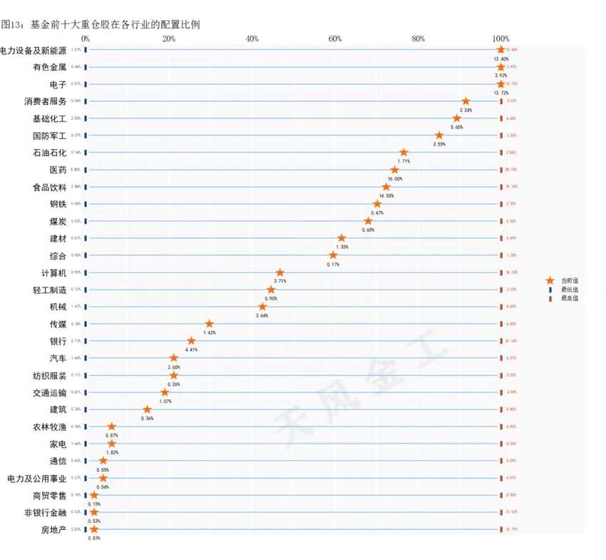基金重倉股對行業(yè)的配置比例:基金對單個行業(yè)的重倉股市值除以基金對所有行業(yè)的重倉股市值之和。