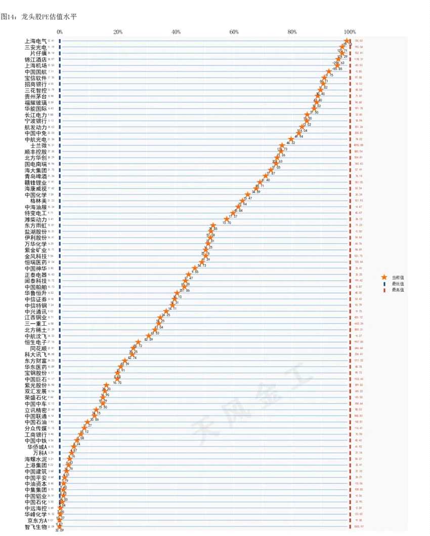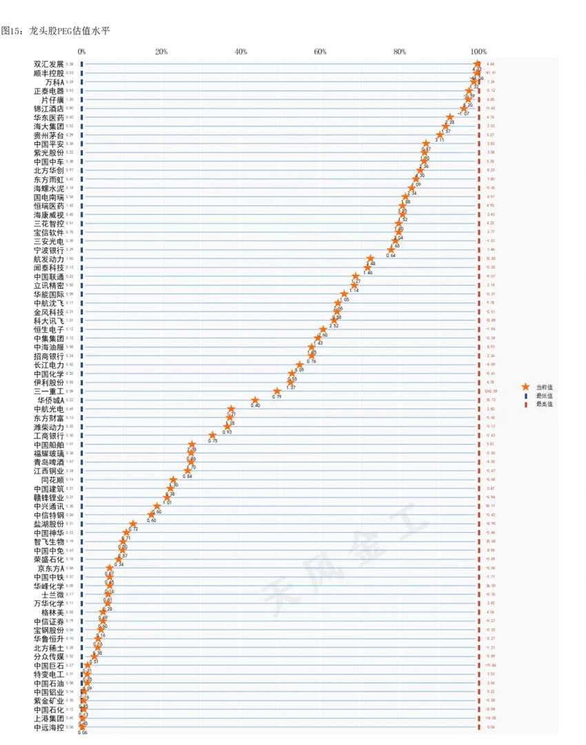 根據中信三級行業(yè)分類,選出各行業(yè)中總市值最大且市值在500億以上的公司,作為行業(yè)龍頭股。下圖反映了龍頭股的估值水平。