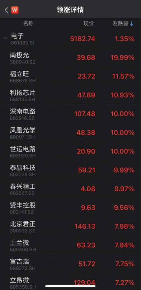 電子行業(yè)中,南極光“20cm”漲停,【福立旺(688678)、股吧】、利揚(yáng)芯片漲逾10%,深南電路、鳳凰光學(xué)、世運(yùn)電路、【泰晶科技(603738)、股吧】、【春興精工(002547)、股吧】漲停。