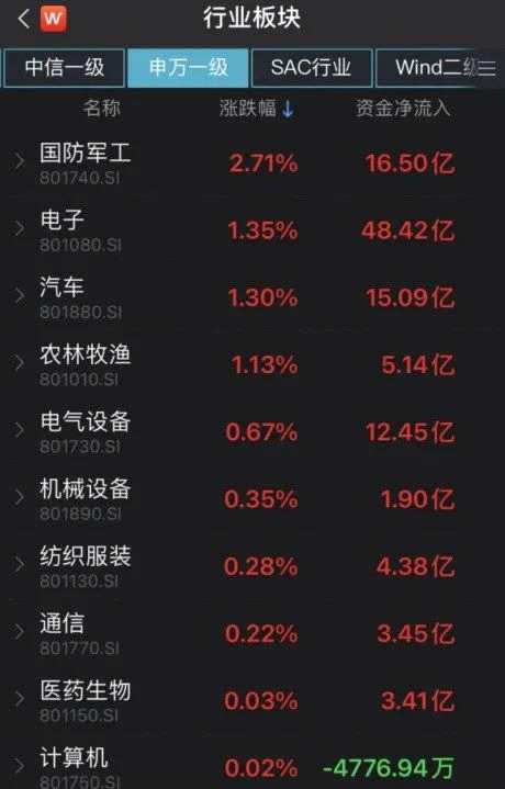 申萬(wàn)一級(jí)行業(yè)中,國(guó)防軍工、電子、汽車行業(yè)漲幅居前,分別上漲2.71%、1.35%、1.30%;休閑服務(wù)、采掘、銀行行業(yè)跌幅居前,分別下跌5.17%、2.82%、2.75%。